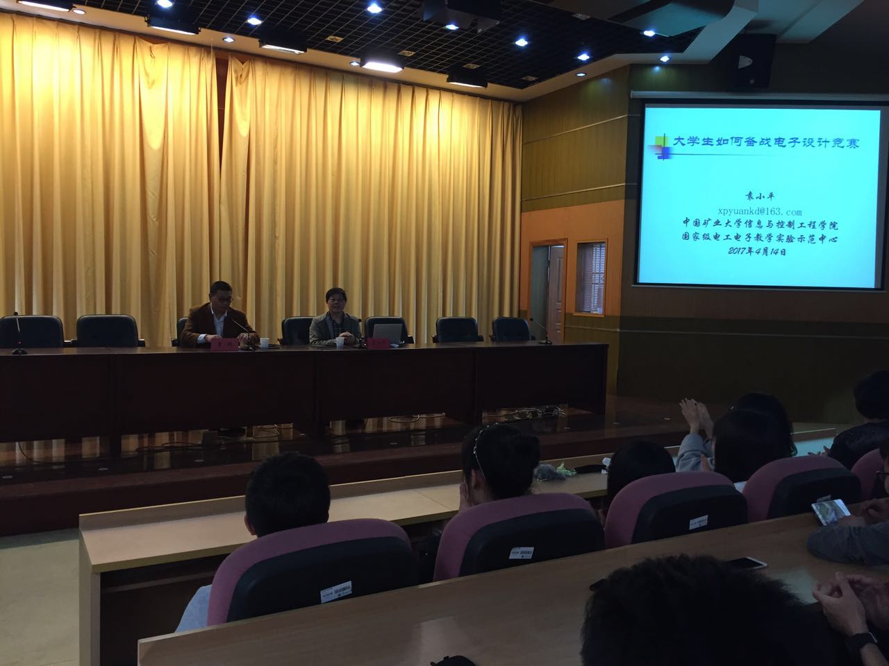 袁小平教授从电子设计的基础知识谈起,分析了电子设计竞赛现状、设计竞赛类型,并结合历年全国电子竞赛江苏赛区竞赛内容,向我们详尽介绍了赛前的技术准备以及如何备战。在报告会接近尾声时,袁教授和在座的师生展开了积极的学术讨论并详细回答了现场师生提出的问题。