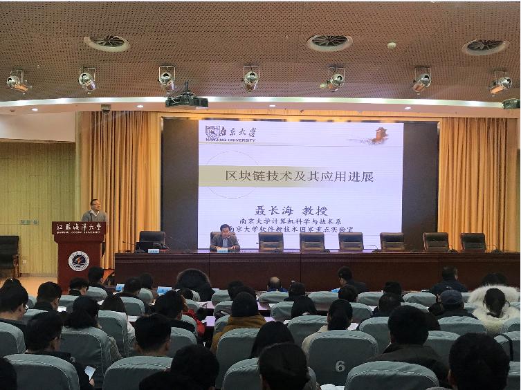 开幕式后安排了专题学术报告会,南京大学计算机系教授、博士生导师、中国计算机学会杰出会员聂长海博士为与会代表及师生作《区块链技术及其应用发展》的专题报告。聂长海教授从什么是区块链、为什么需要区块链、比特币与区块链等六个方面为广大与会者送上了关于区块链技术及其应用发展的学术大餐,聂教授的精彩报告普及了区块链相关知识,开阔了视野,启迪了思维,增长了见识。