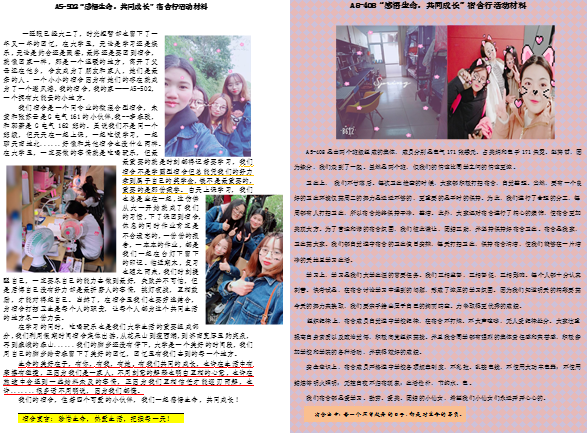 本次活动,以“感悟生命,共同成长——生命教育与宿舍同行”为主题,面向全院在校生征集作品。征集作品包含宿舍所有成员和宿舍环境的全景照,入校以来生命成长过程中的收获,以及有关珍惜生命的宿舍宣言。此次活动共收到130份作品。经过评审,最终评选出18件获奖作品,其中,一等奖作品4件,二等奖作品6件,三等奖作品8件。