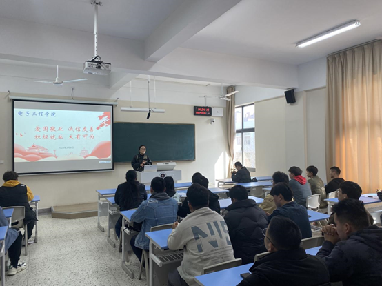 于子程对当前就业形势、就业意识、简历制作、面试技巧、三方协议签订、档案派遣和学院就业暖心服务措施等相关事宜进行详细讲解。张玲围绕爱国爱校、主动就业;爱岗敬业、诚信就业;就业荣校、大有可为三个方面展开宣讲,鼓励同学们积极就业,争做品业能兼优的电子员工。