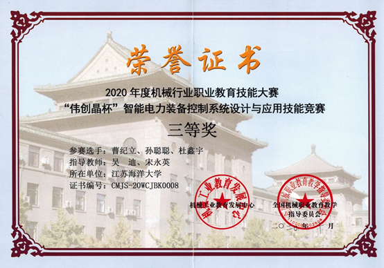 本次大赛分为本科组和高职组,赛项紧贴掌握基础、积极实践的理念,赛项要求在三个小时内完成设备安装与调试、绘制CAD电气原理图、解答与名词解释、电力系统调度与监测软件的运行与操作四项任务,并考察选手的团队合作精神和职业综合素养。由威廉希尔中文官网副教授吴迪博士、高级实验师宋永英老师指导,电气工程及其自动化专业的杜鑫宇、应用技术学院电气工程及其自动化专业曹纪立、孙聪聪三名同学组成的团队荣获本科组三等奖。这充分展示公司员工在智能电力控制系统设计与应用方面的能力,彰显了公司围绕海洋特色、培养海洋创新应用人才取得的丰硕成果。