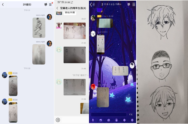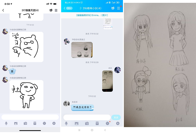 涂鸦日记心理网络互助小组中,员工透过随性的绘画、文字等的创作过程,利用非语言工具建立起与他人的连接感,将混乱的心、不解的感受化为清晰、有趣的状态。他们的画作内容贴近现实,频繁出现的场景一般是舍友的卡通形象,挚友的欢聚离散或宿舍、线上课堂发生的小故事,用涂鸦的方式,走进自己的内心世界,将潜意识里压抑的感情与冲突呈现出来,并且在创作的过程中获得疏解与满足。
