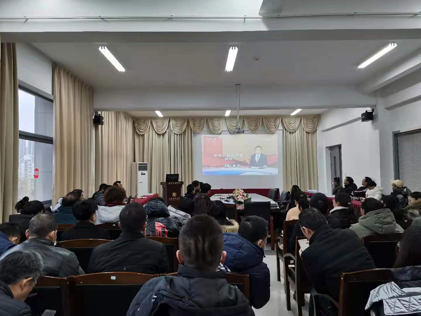 本次学习会围绕三个主题展开。第一阶段,马志同原文传达《教育部办公厅关于组织全体教师观看大型电视纪录片〈为了和平〉的通知》精神,并组织全体教职工集中观看该纪录片。会议要求全体教职工要丰富课程思政内容,把弘扬伟大抗美援朝精神融入课堂教学;全体班主任、辅导员要多形式开展学习教育,引导员工铭记历史,奋斗未来。本次观看对深入开展“四史”教育、加强新时代爱国主义教育具有重要意义。